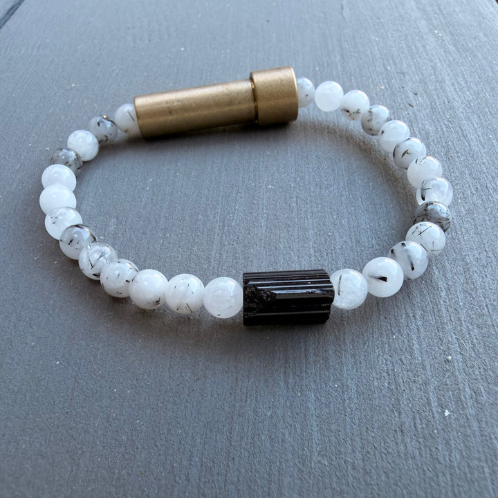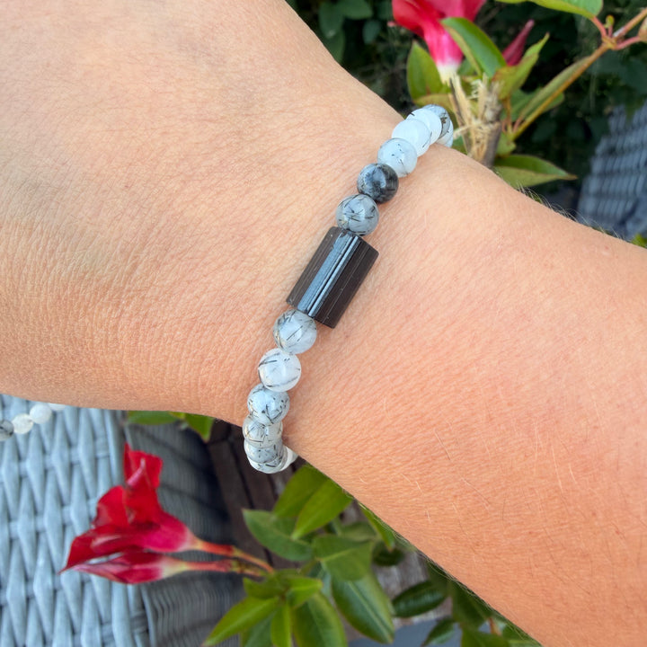 Made with Tourmalinated Quartz, this grounding stone merges the energy of Black Tourmaline and Clear Quartz—protective earth meets illuminating clarity. It helps you release what weighs you down, reconnect with your truth, and rise rooted in balance and strength.